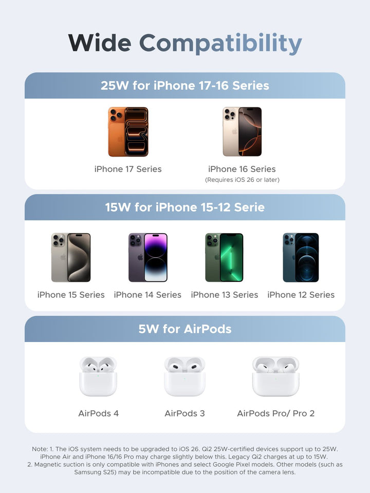 - 25W Wireless Fast Charge: Qi2-certified power charges iPhone 16 Pro Max to 50% in just 30 minutes.